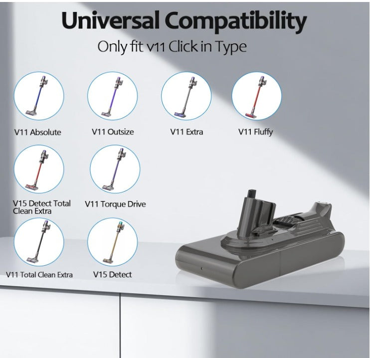 The DYS V11 25.2V 6.0Ah Click-in battery is a suitable replacement for the DYS SV15 Battery, V15 Detect Battery, 970425-01, 970938-01, V11 Click-in, and V11 Torque Drive Vacuum Cleaner. It provides a 6.0Ah capacity and is compatible with various models.